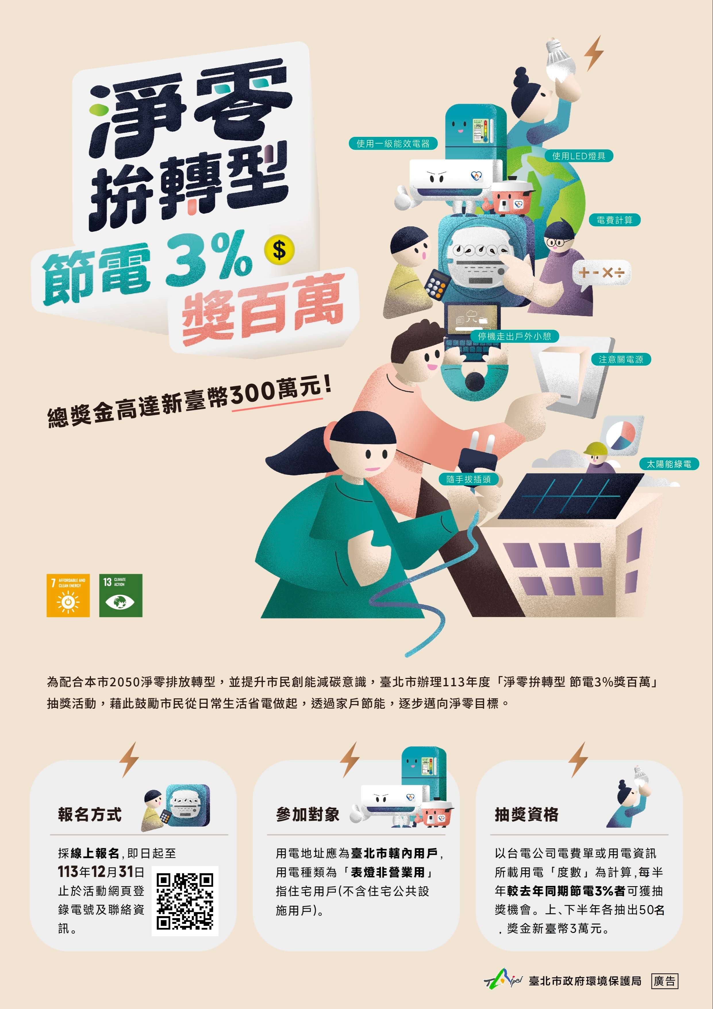二、環保局為鼓勵市民落實節能減碳行動,即日起至113年12月31日辦理「淨零拚轉型節電3%獎百萬」抽獎活動,參加對象為臺北市轄內「住宅用戶」,每半年較去年同期節電達3%即可參加抽獎,113上下半年各抽出50名,每名獎金新臺幣3萬元。
