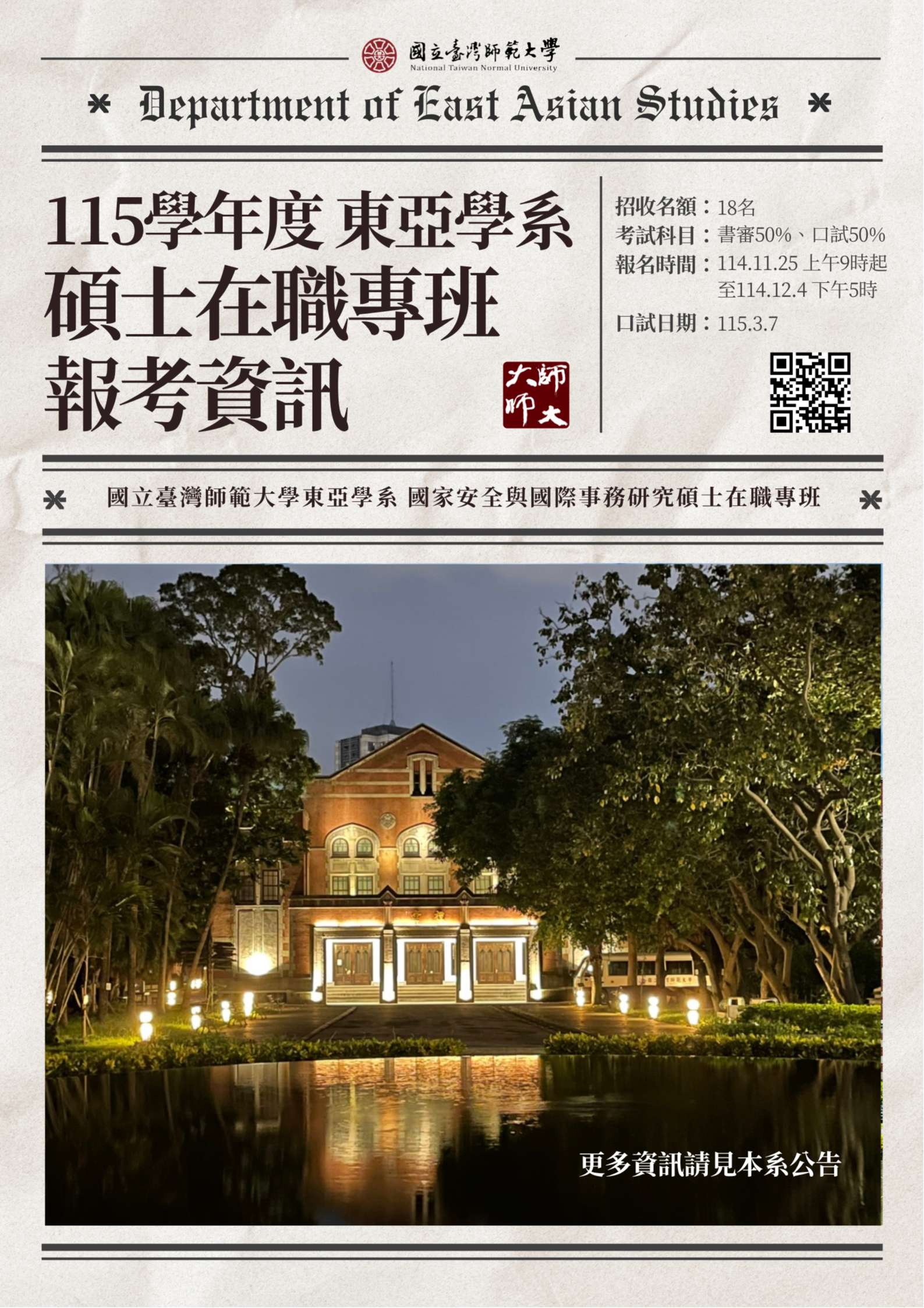 轉知「國立臺灣師範大學東亞學系「國家安全與國際事務研究碩士在職專班」115學年度招生訊息」,詳見附件。