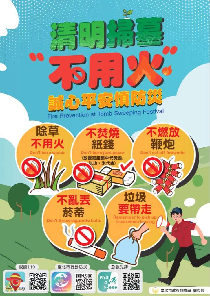 清明掃墓慎終追遠時節,為避免林野火災發生,請市民朋友掃墓祭祖不使用火源,多加利用本市集中代焚紙錢及線上祭祖服務,並且除草不用火、帶走垃圾、勿亂丟菸蒂、燃放爆竹,共同做好防火工作。