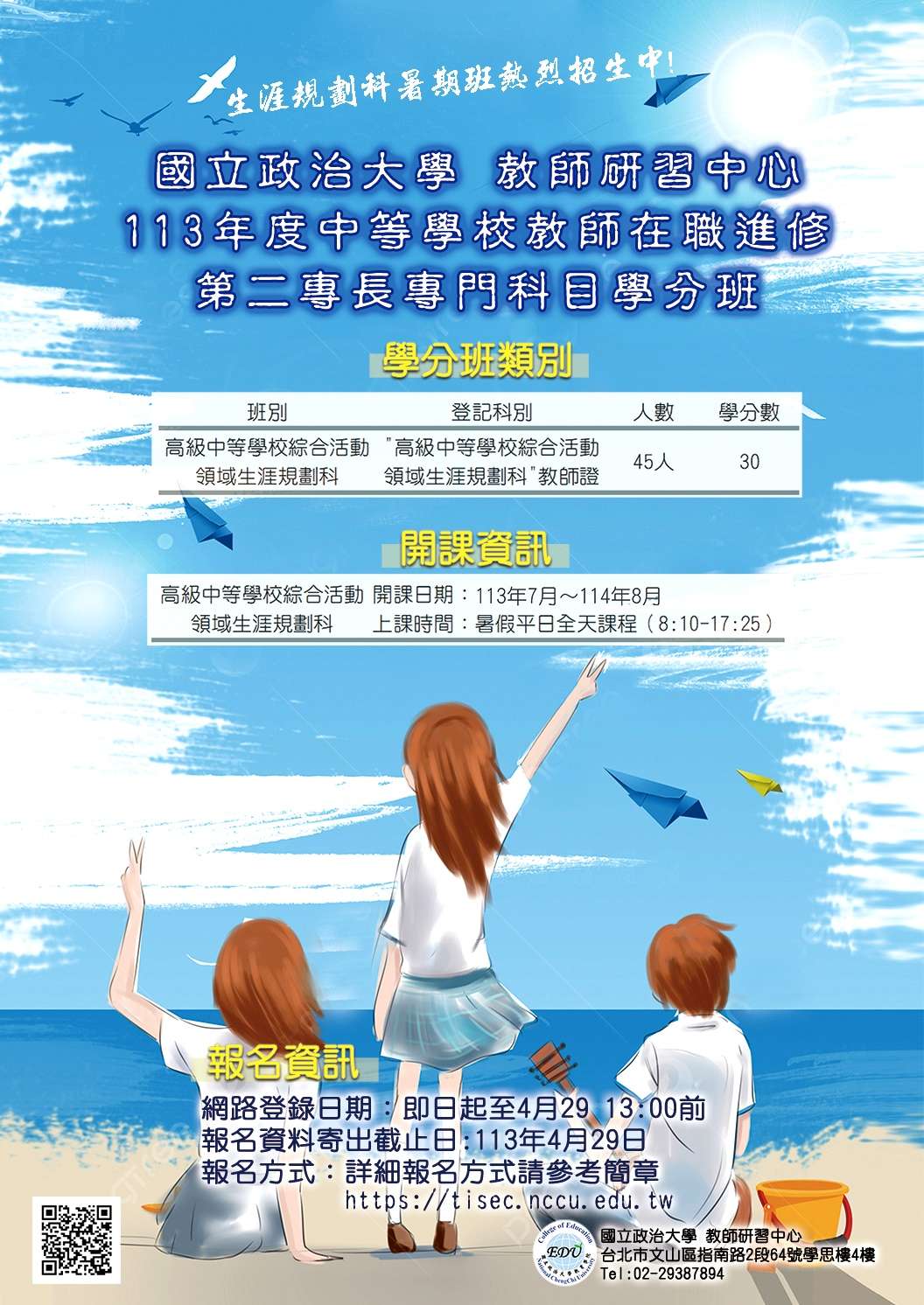國立政治大學教育學院教師研習中心辦理「113年度中等學校教師在職進修第二專長專門科目學分班」招生甄審簡章請參閱附件資料。