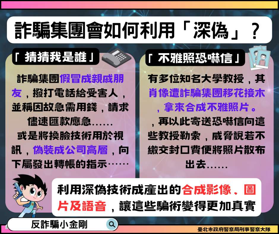 新型態詐騙方式宣導,請留意眼見不一定為真,任何人要求認證碼、邀請加入投資打工社群或轉帳借款,都要親自打電話或要求面交款項,以免落入新型態詐騙陷阱。