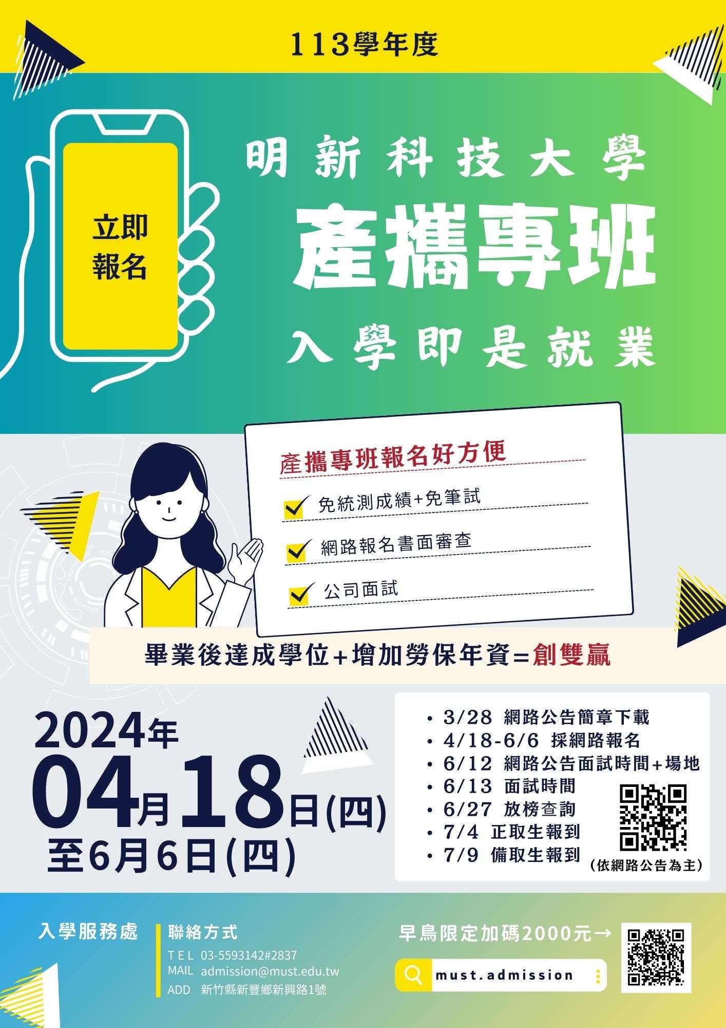 明新科技大學113學年度產學攜手合作計畫專班獨立招生,詳見附件。
