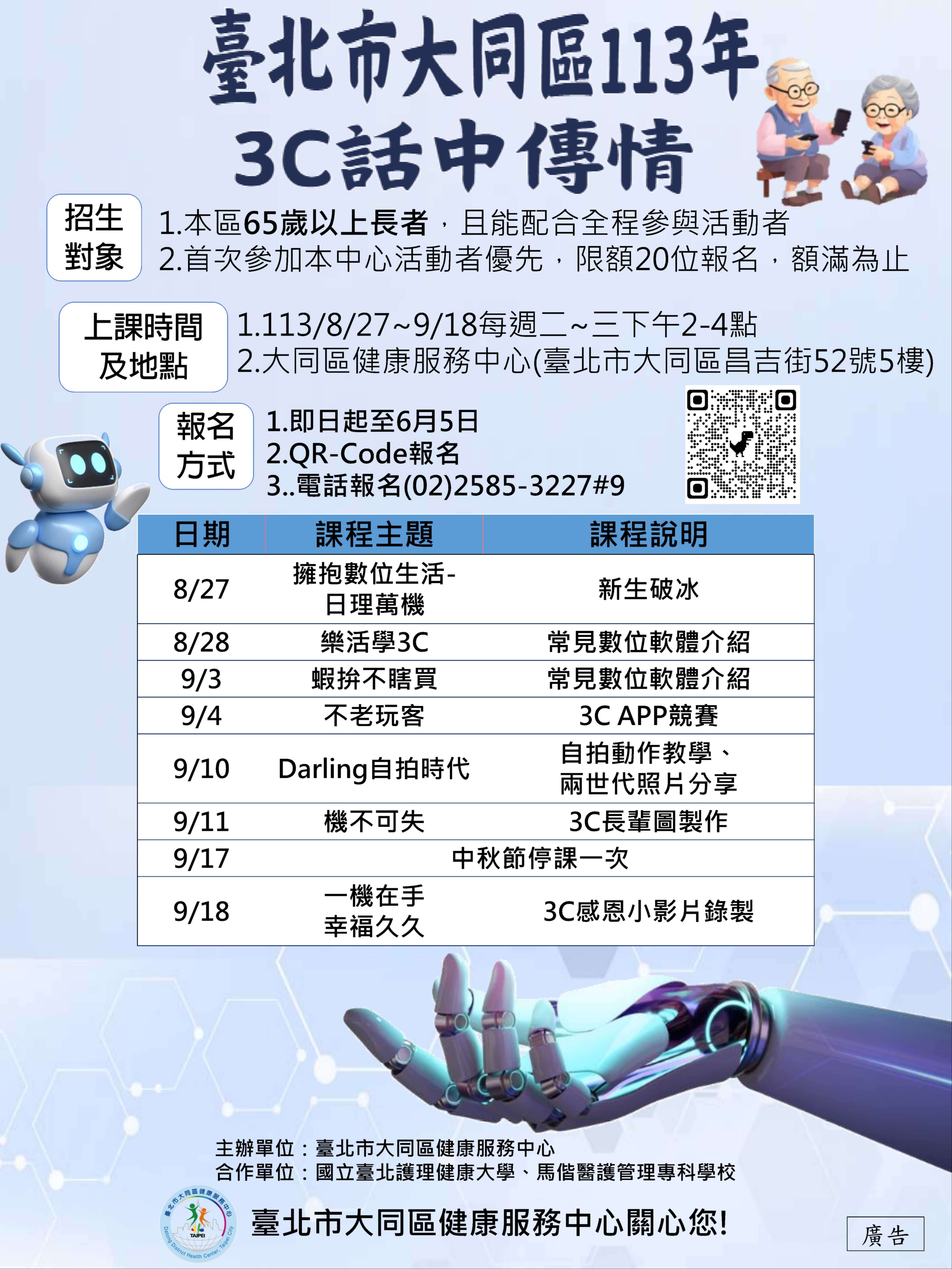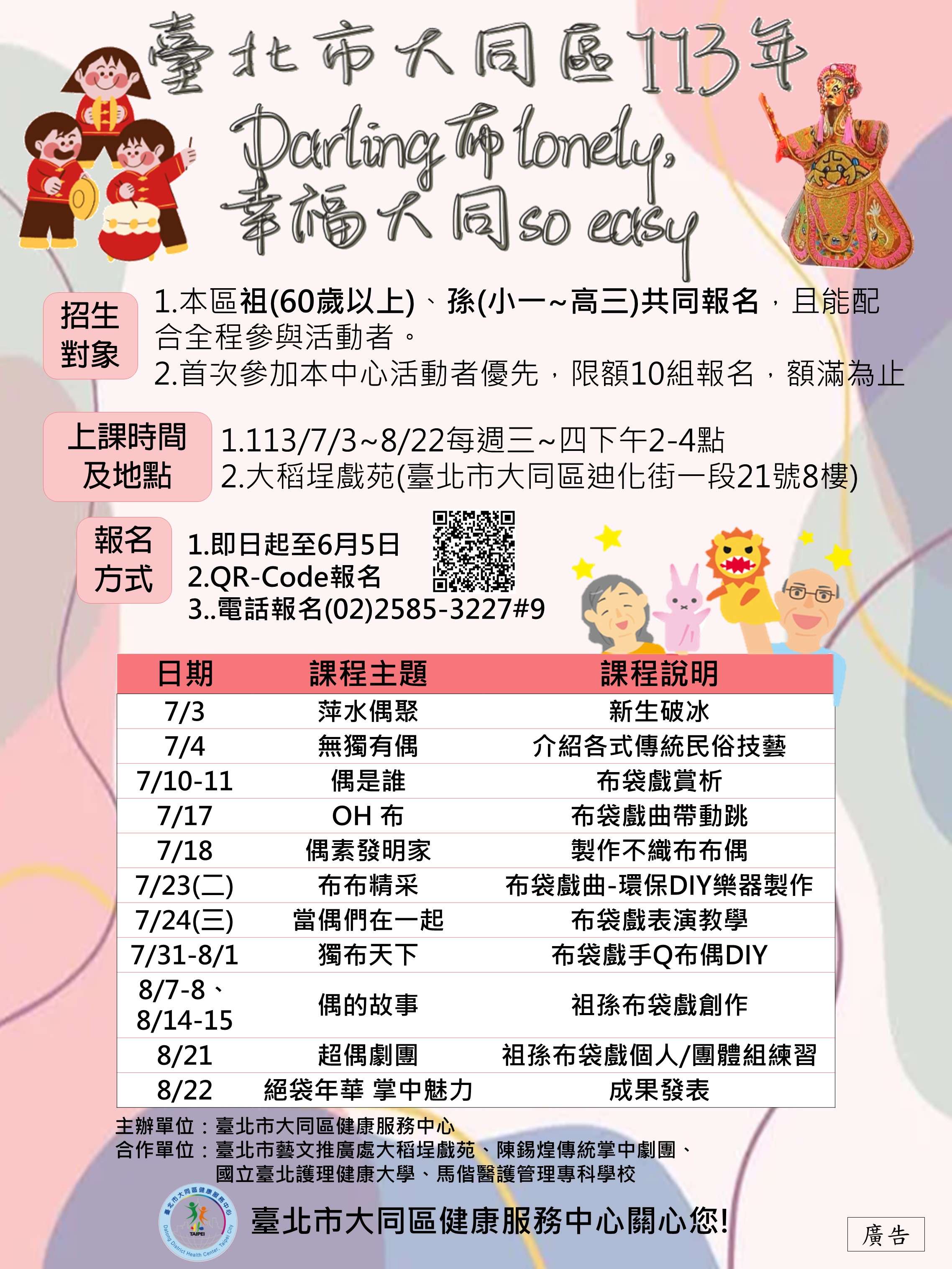 二、為促進長者走出戶外、倡導敬老氛圍、增進世代融合,該中心擬於113年7月3日至9月18日期間,辦理「Darling布lonely,幸福大同so easy」及「3C話中傳情」活動:
