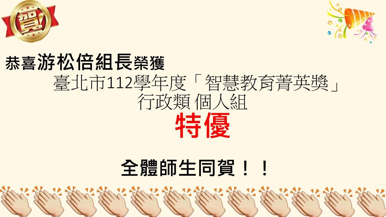 臺北市112學年度智慧教育菁英獎 行政類 個人組 特優 游松倍組長