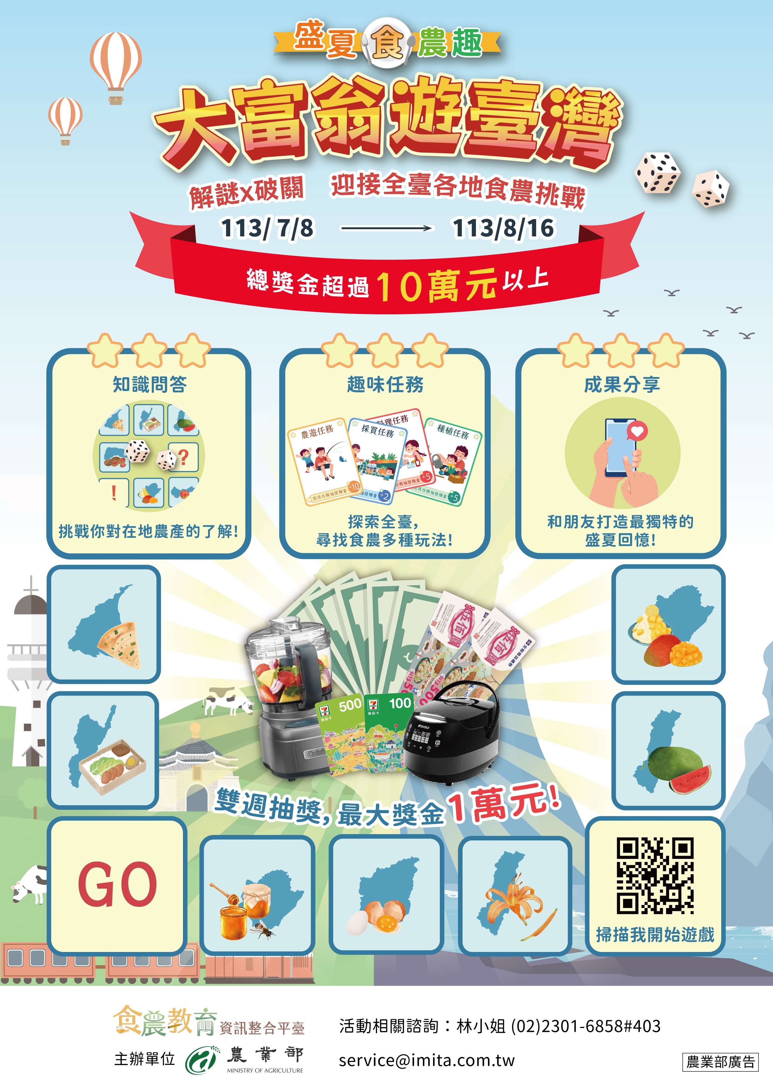 三、為促使大眾更加瞭解食農教育,該部訂於113年7月8日至8月16日舉辦「盛夏食農趣:大富翁遊臺灣」食農教育推廣活動(活動網址如公告連結),提供食農教育相關知識問答、任務體驗與成果分享等遊戲,參與活動即可抽獎,總獎金超過10萬元,有興趣者歡迎踴躍參與。