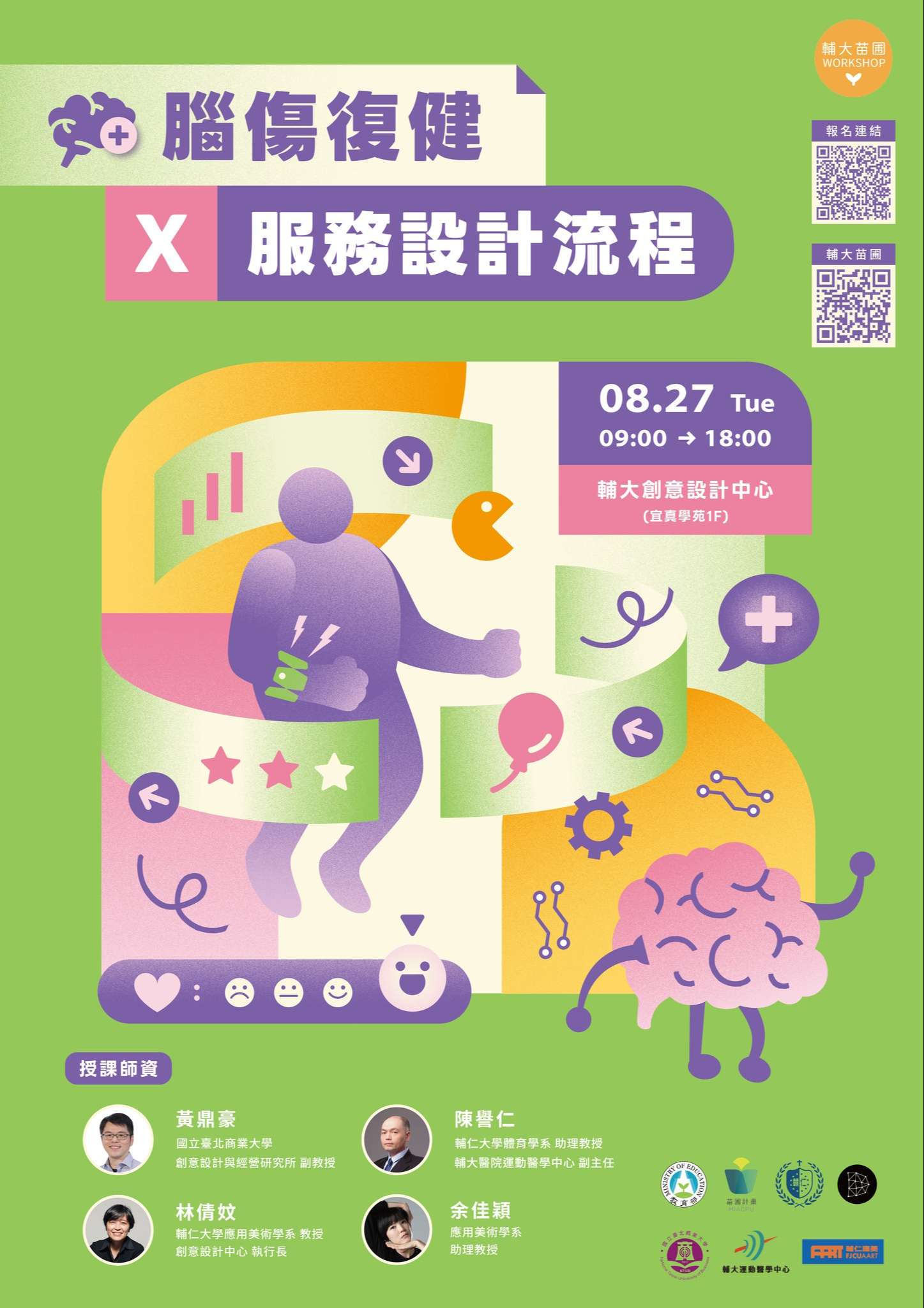 二、活動目的:本活動由教育部「跨領域教師發展暨人才培育計畫」補助辦理,本工作坊集結運動生理、設計思考創新引導、使用者經驗設計、故事思維設計等跨域師資,帶領學員探討中風症狀、患者復健需求及流程,並以輔大創意設計中心的智能眼鏡腦傷居家復健「人機互動式復健系統」美國、台灣發明專利為例,作為科技輔助復健的介紹;藉由顧客旅程地圖工具,了解中風患者在復健過程中可能遇到的各種問題,並透過服務設計優化復健流程。