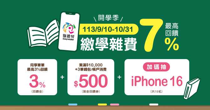 (二)活動內容:活動期間當月使用悠遊付每筆扣款享3%(限量,每戶回饋上限100元)悠遊付回饋金,另累積消費新臺幣(以下同)10,000元加3筆帳戶或錢包消費即回饋500元指定通路現金回饋券,活動期間每戶最高回饋7%悠遊付回饋金(或回饋券)。