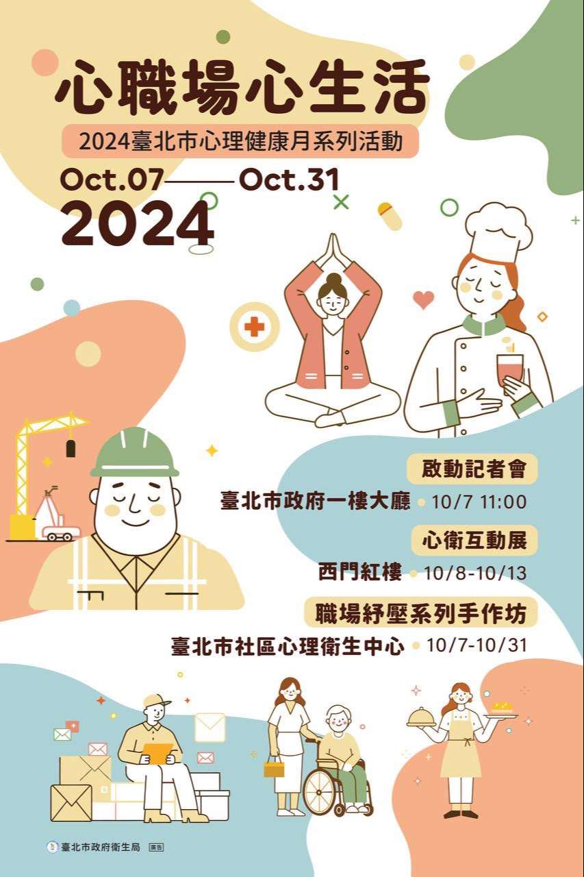 一、依據本府衛生局113年9月23日府授衛心字第1133148199號函辦理。 二、台北市衛生局近期辦理「2024心理健康月-『心職場心生活』」系列活動。