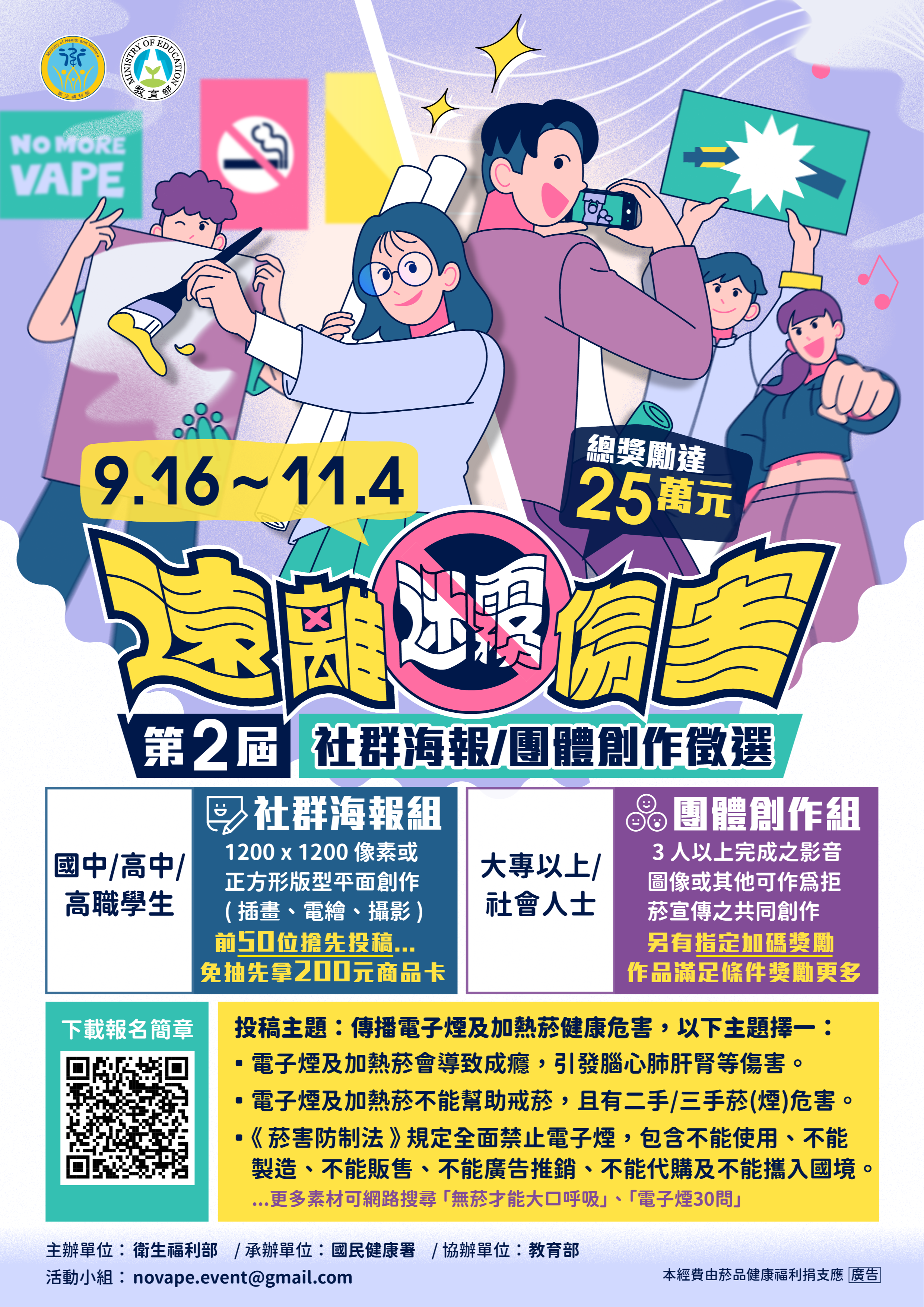 二、為避免電子煙、加熱式菸品等新興菸品入侵校園,造成健康危害,衛生福利部(承辦單位:衛生福利部國民健康署)爰與教育部共同辦理旨揭活動(徵選簡章及活動海報如公告附件),以宣導電子煙及加熱式菸品等新類型菸品之危害,共同維護青少年健康。活動相關內容如下: