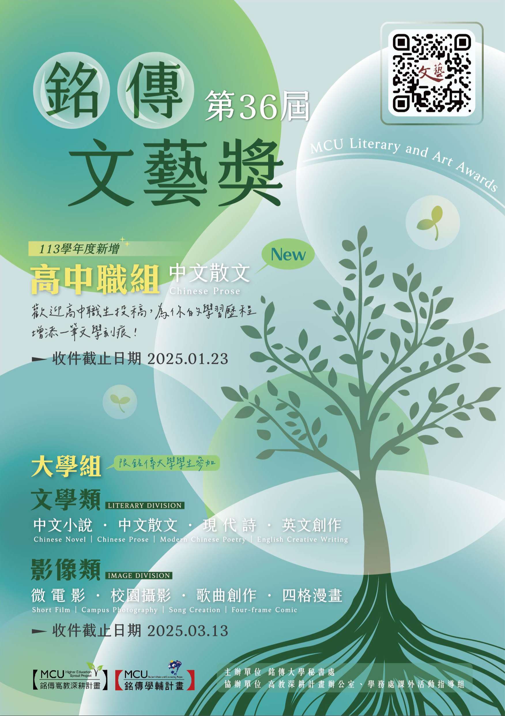 轉知公告銘傳大學第36屆文藝獎高中職散文組徵文辦法及海報電子檔。