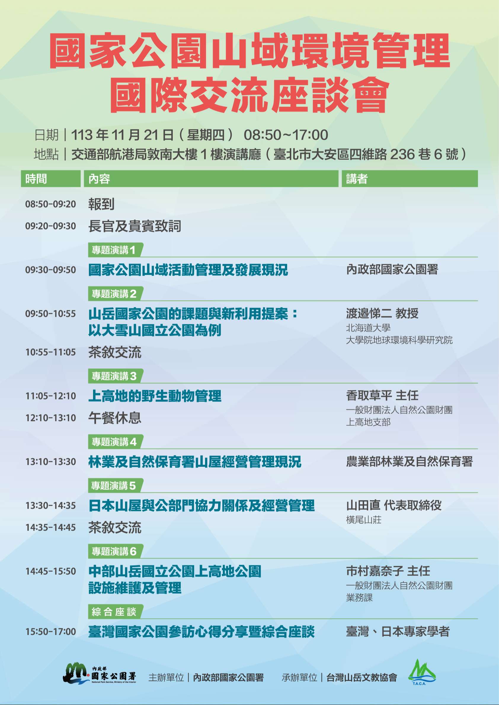 二、本次座談會訂於113年11月21日(星期四)假交通部航港局敦南大樓1樓演講廳舉行,邀請日本及國內相關專家學者進行專題演講,分享交流國內外相關經驗,並且研討適合我國山域環境管理執行策略之建議。座談會議程相關資訊請參閱附件海報。
