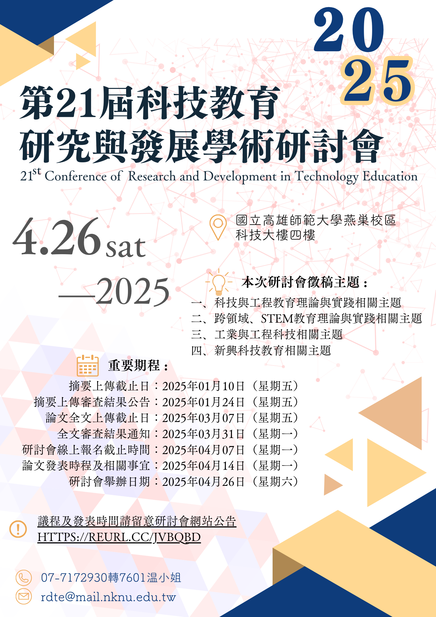 轉知公告國立高雄師範大學2025-21th科技教育研究與發展學術研討會論文徵稿資訊。