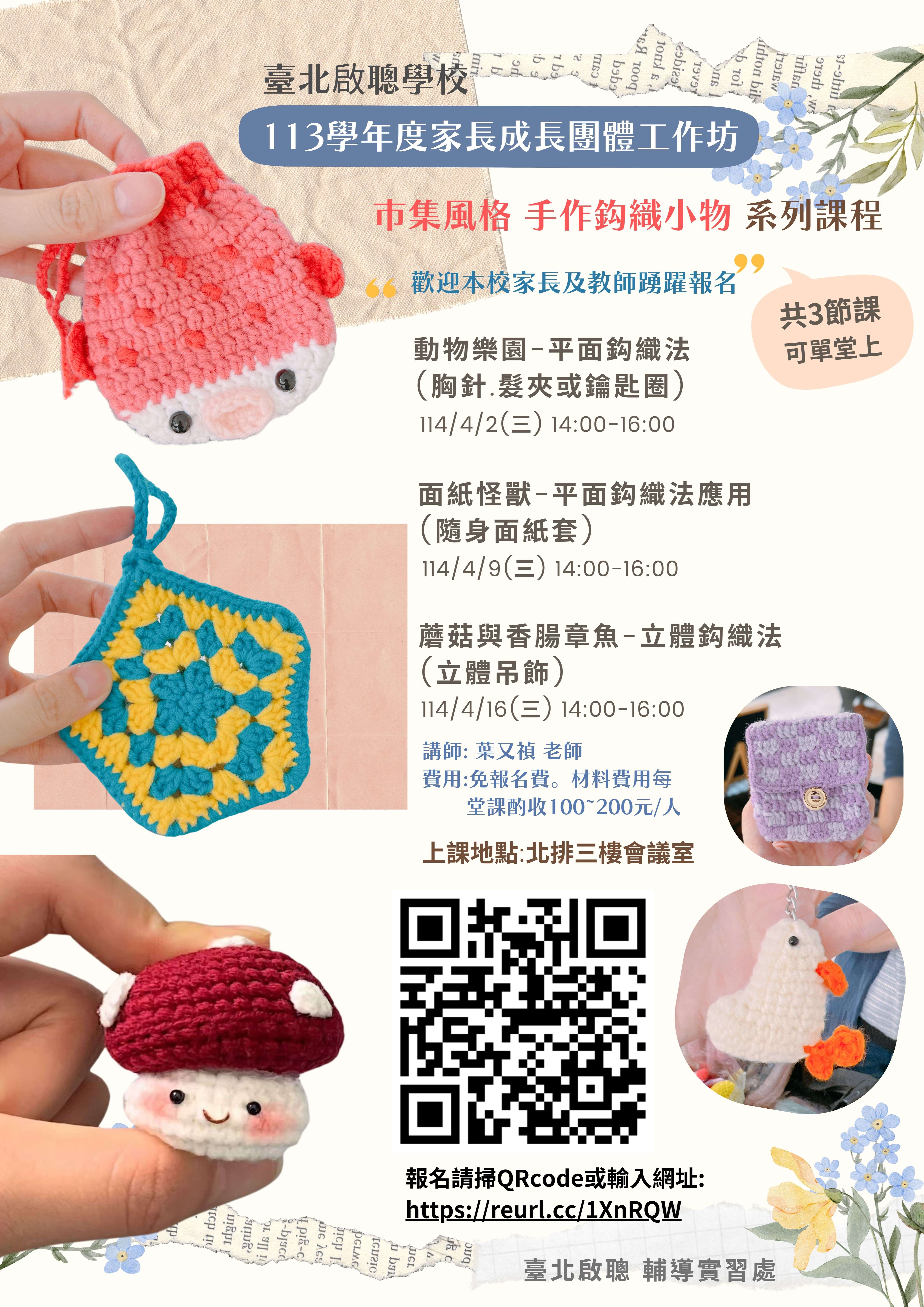「市集風格手作鈎織小物 系列課程」開放報名中,歡迎本校家長、本校教師踴躍報名。