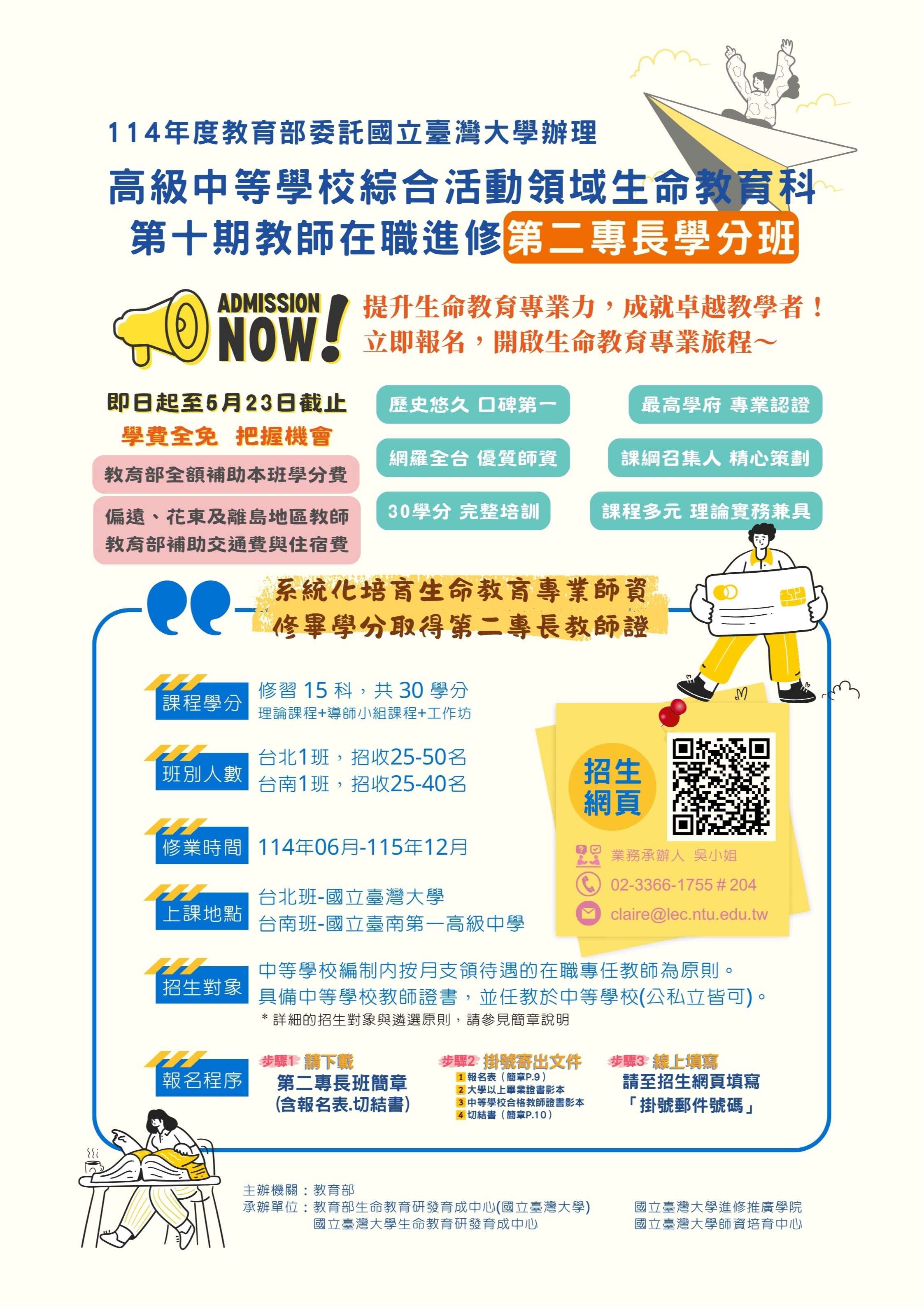 教育部委託台大生命教育研發育成中心辦理「114年度高級中等學校綜合活動領域生命教育科第十期教師在職進修第二專長學分班」相關訊息如附件。