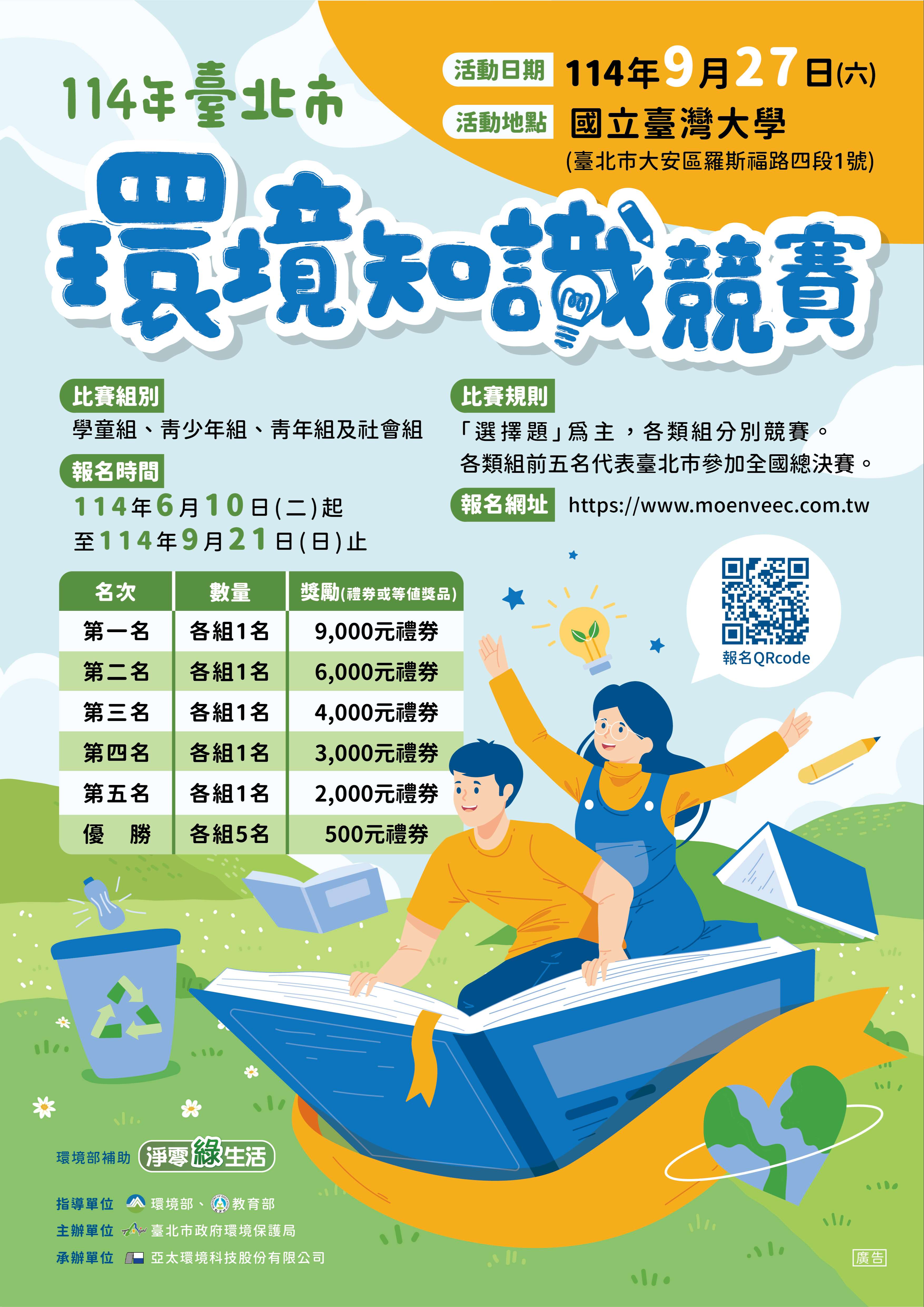 四、本市初賽各類組優勝前5名將代表本市參加環境部辦理之全國決賽,初賽各類組獎勵方法詳附件競賽須知。有相關問題請洽該局彭國淵先生(電話:02-2720- 8889分機7232),或洽該局委辦單位亞太環境科技公司黃名倫先生(電話:02-2218-9099分機233)。