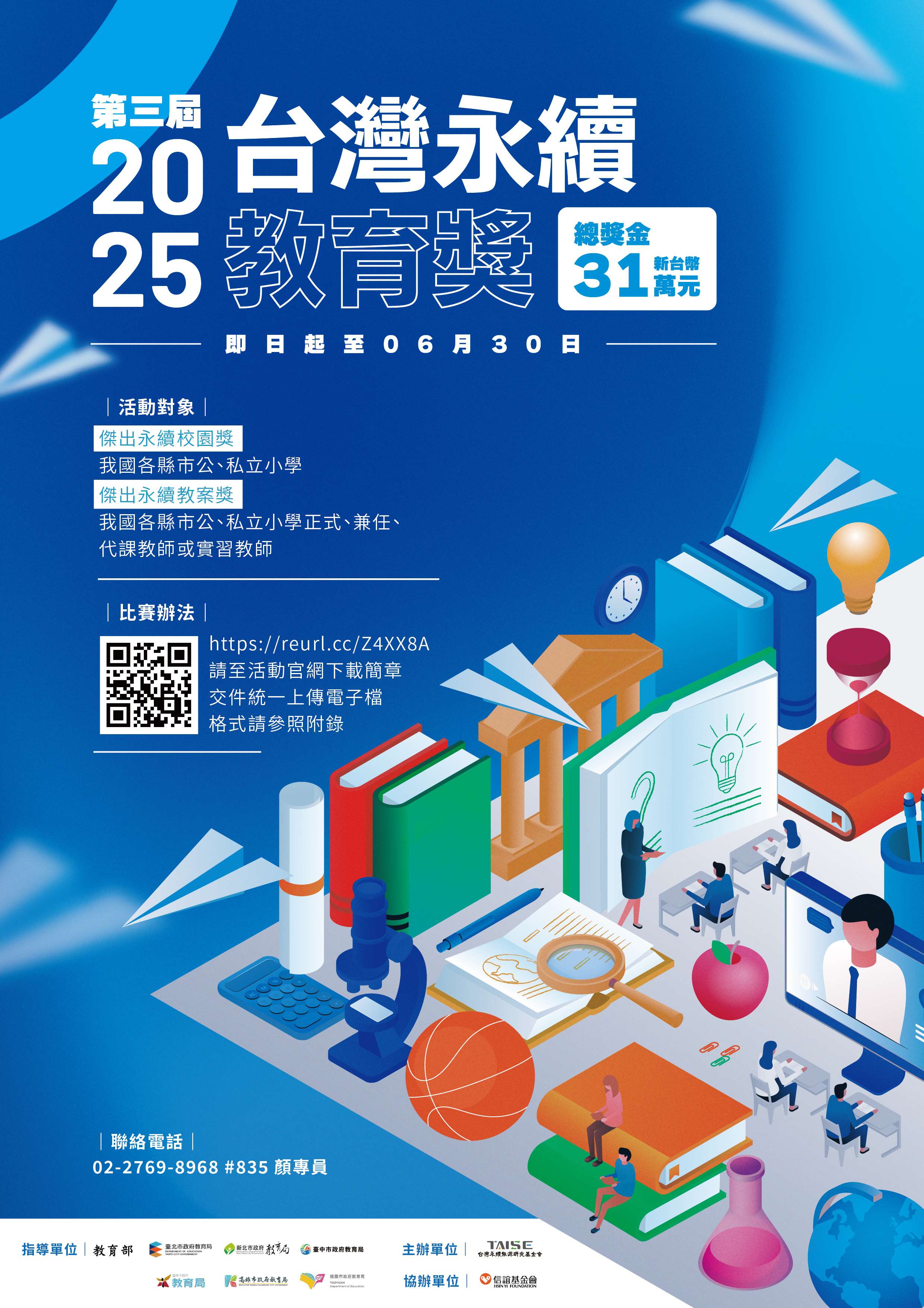 二、為擴大影響力,將「永續」的概念深植各級教育,並鼓勵更多校長、老師將淨零永續議題融入校園治理及教案之中,該會辦理2025第三屆《台灣永續教育獎》,徵件時間至6月30日。