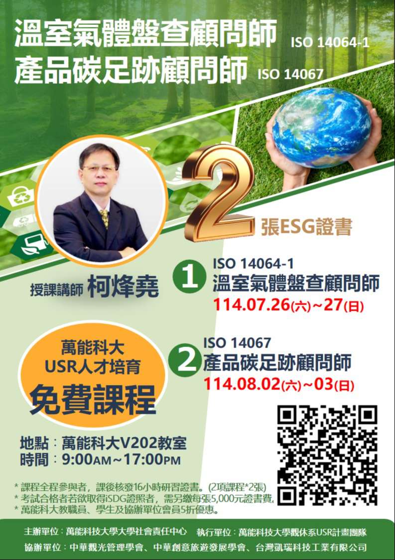 萬能學校財團法人萬能科技大學觀光與休閒事業管理系辦理「ESG人才培育研習課程」訊息 詳如附件