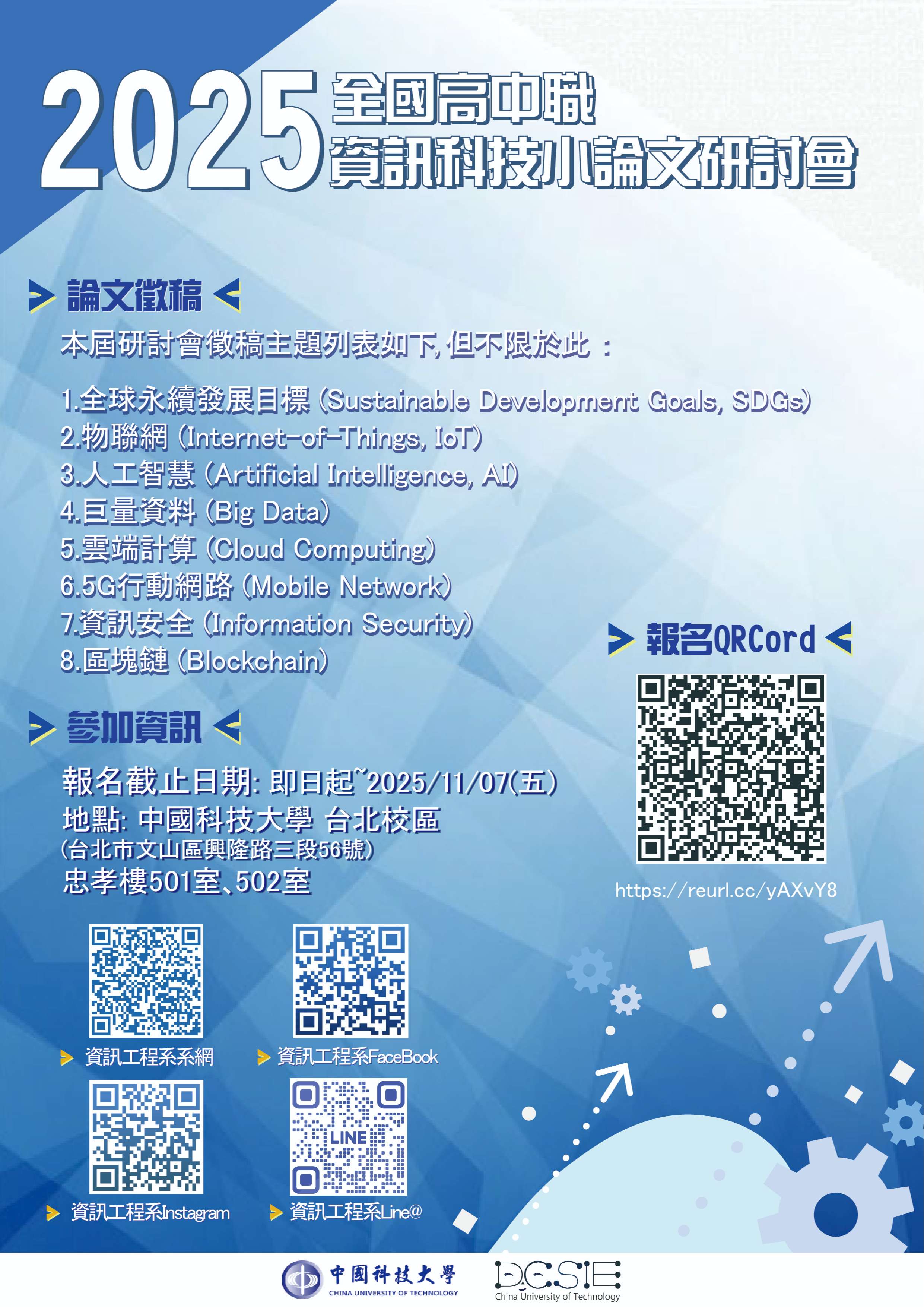 協助轉知公告中國科技大學資訊學院資訊工程系辦理「2025全國高中職小論文研討會」。