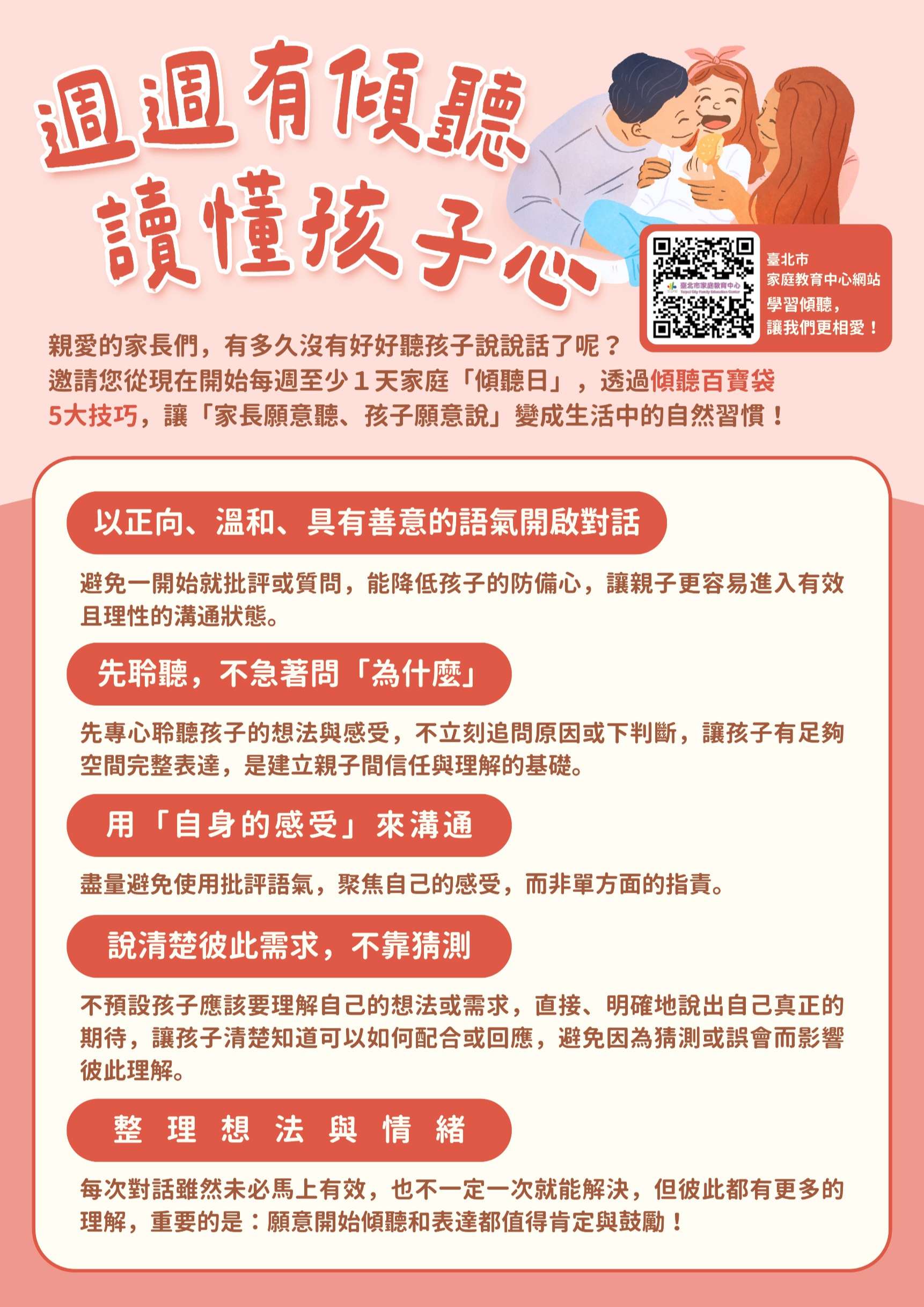 臺北市家庭教育中心「週週有傾聽,讀懂孩子心」相關訊息如附件。