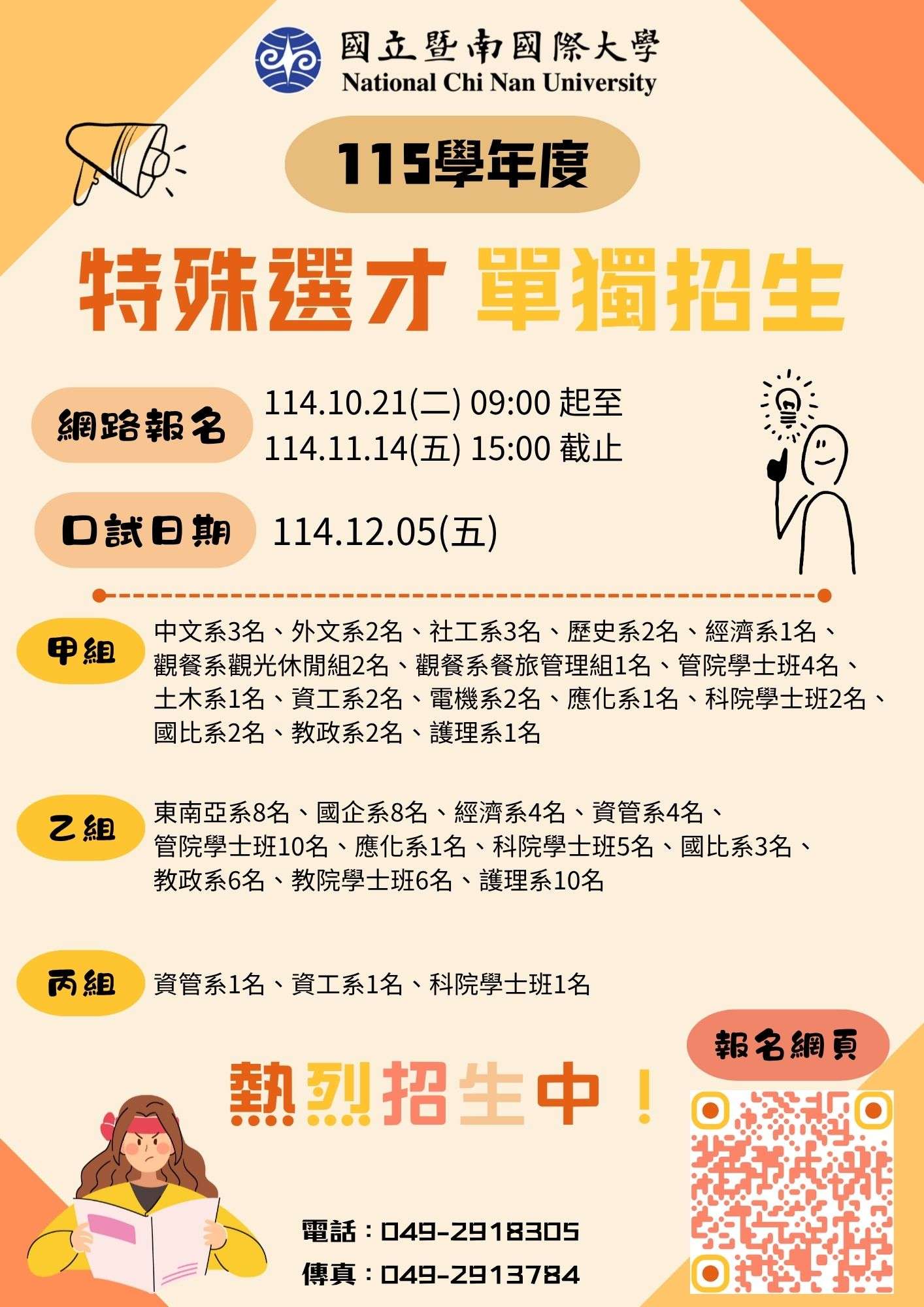 轉知「國立暨南國際大學115學年度特殊選才單獨招生訊息」,詳見附件。