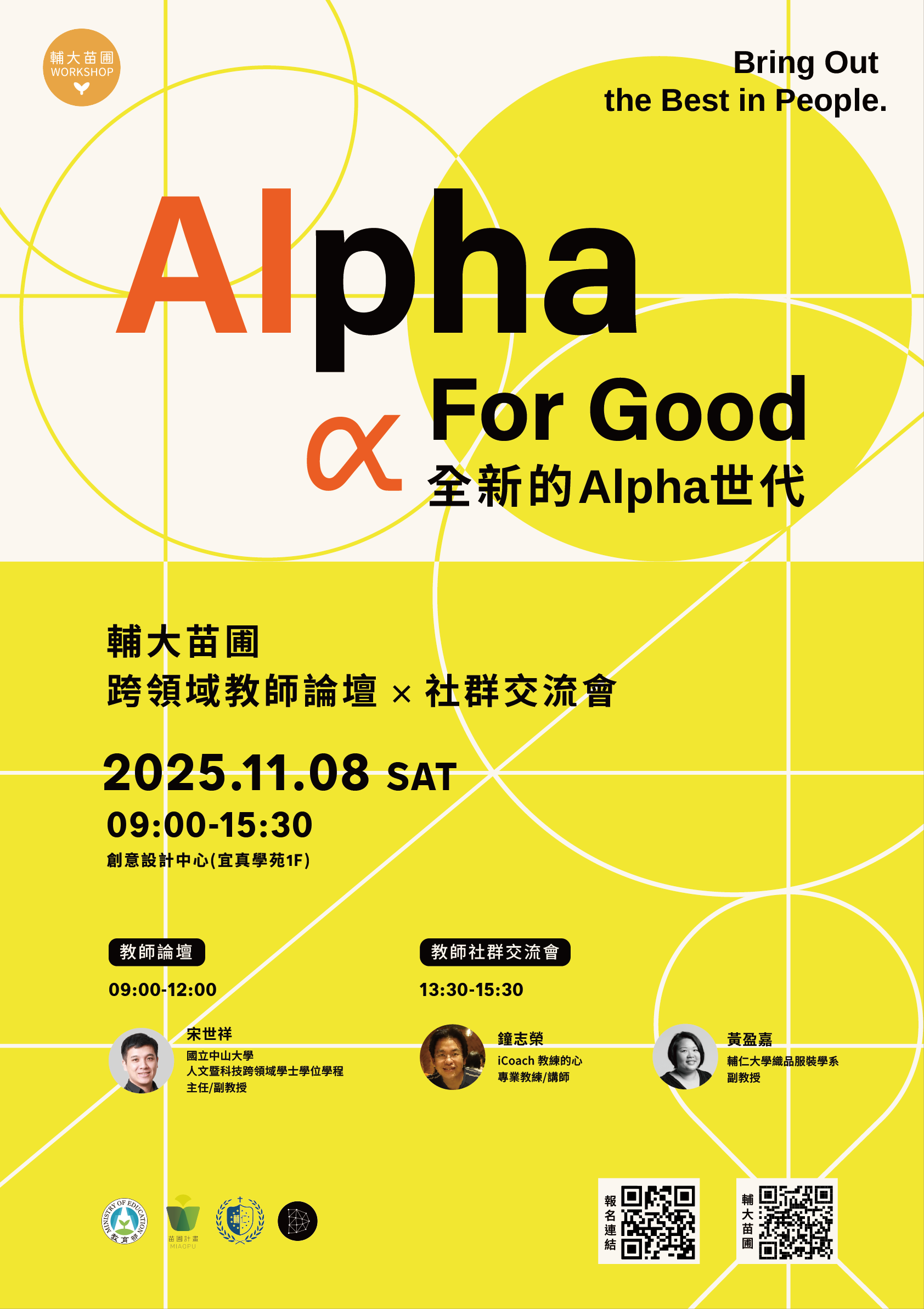 輔仁大學學校財團法人輔仁大學訂於114年11月8日舉辦教育部跨領域教師發展暨人才培育計畫輔大苗圃【Alpha For Good:全新的Alpha世代】跨領域教師論壇&社群交流會訊息