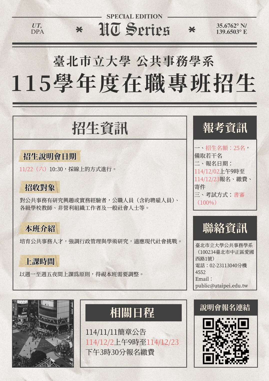 轉知「臺北市立大學公共事務學系辦理 115 學年度在職專班招生」,詳見附件。