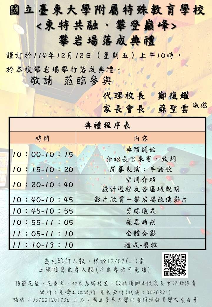 一、依據臺東大學附屬特殊教育學校114年12月1日東大附特秘字第1140006661號函辦理。