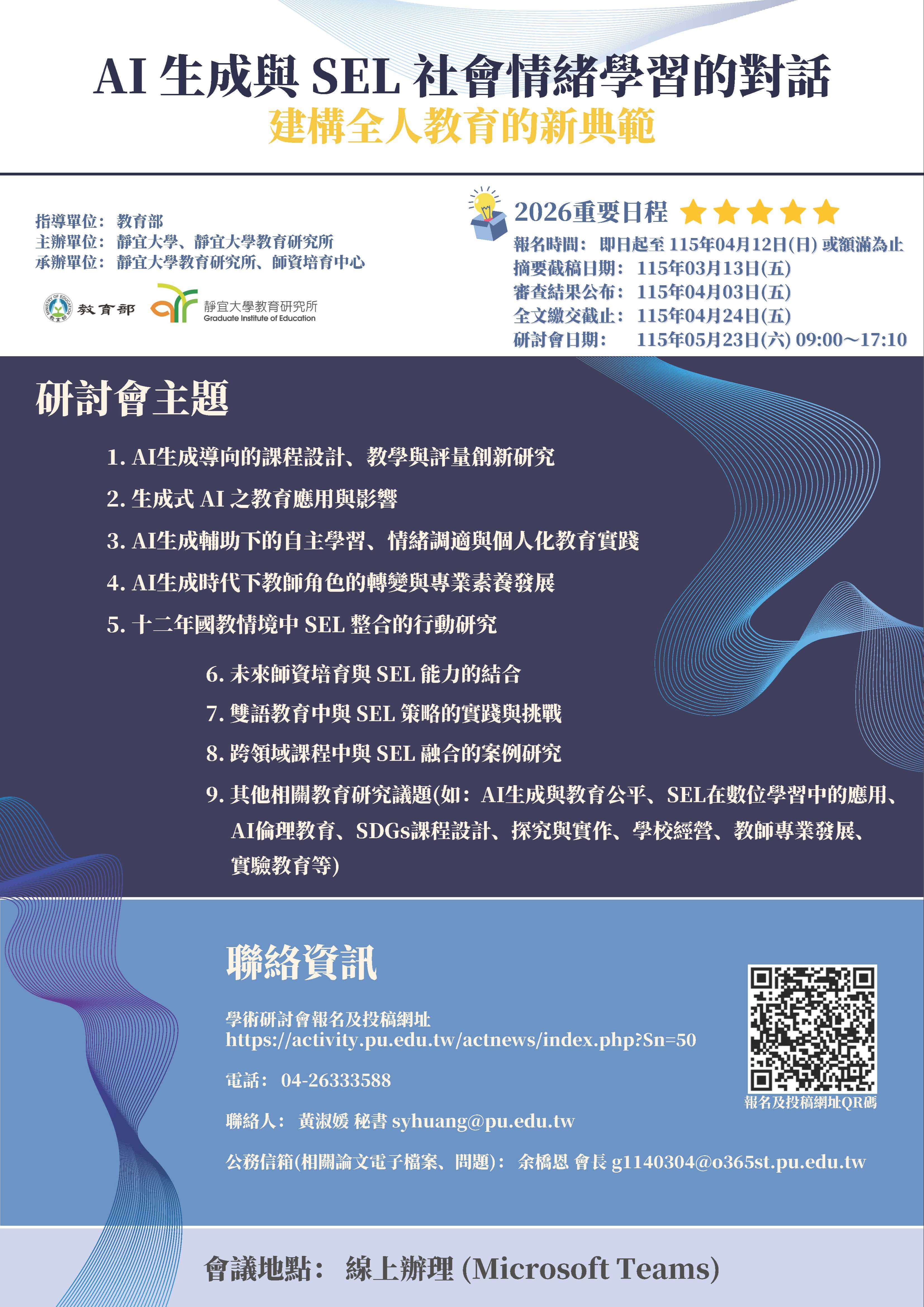 靜宜大學教育研究所舉辦「AI生成與SEL社會情緒學習的對話:建構全人教育的新典範」學術研討會徵稿訊息